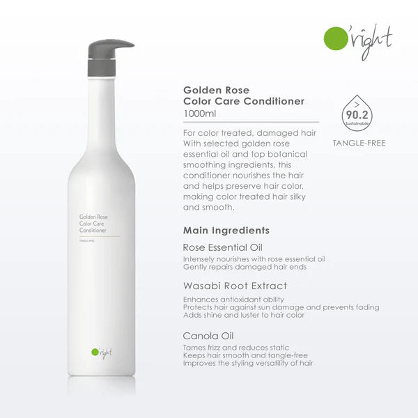 Deeply nourish colour-treated hair with O'right Golden Rose Color Care Conditioner. Golden rose oil and wasabi root extract preserve colour, add shine and protect against sun damage. 90.2% natural, vegan and carbon-neutral.